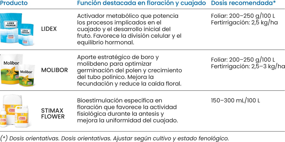 Por ello, nuestras soluciones están diseñadas para actuar de forma sincronizada con cada fase del proceso reproductivo, desde la activación previa a la floración hasta la consolidación del fruto recién cuajado.
